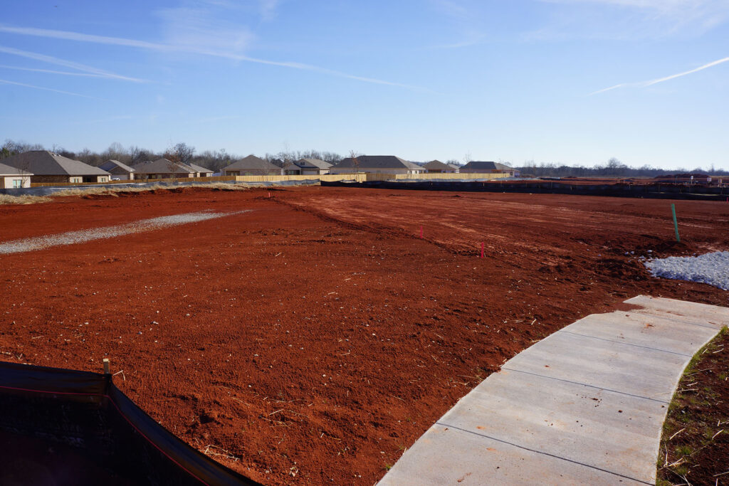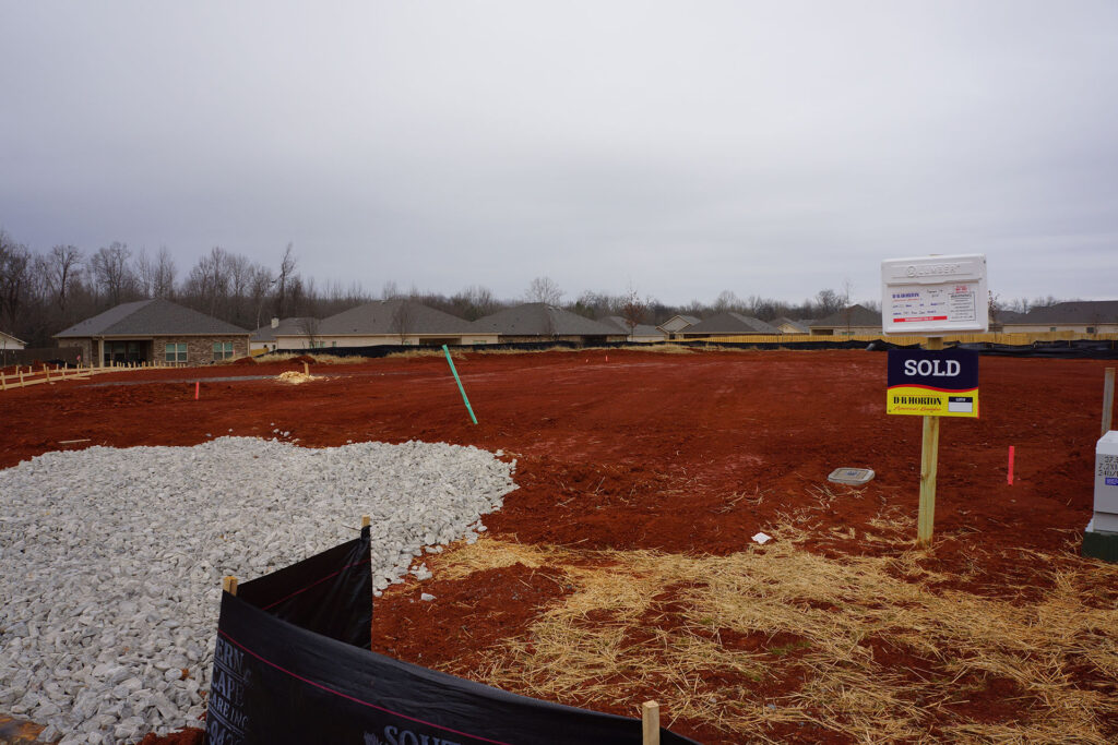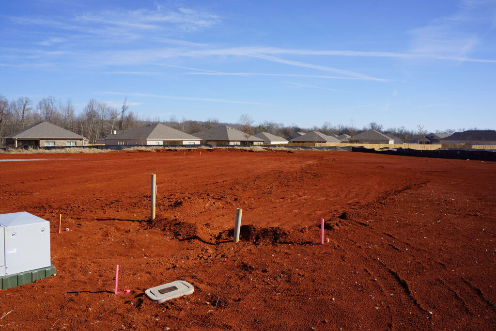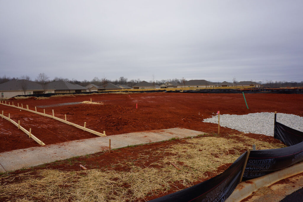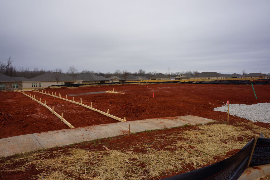 The construction workers put some gravel on the entrance to the lot and marked out where they frame the construction for the slab.