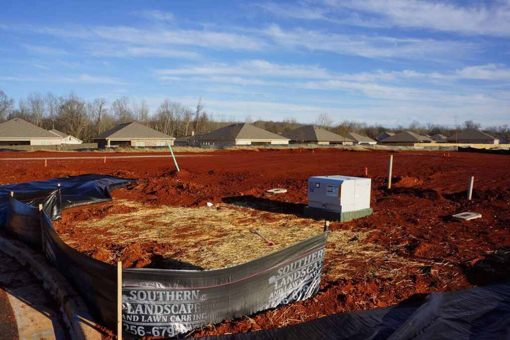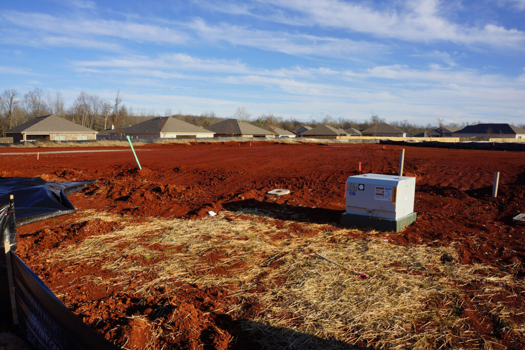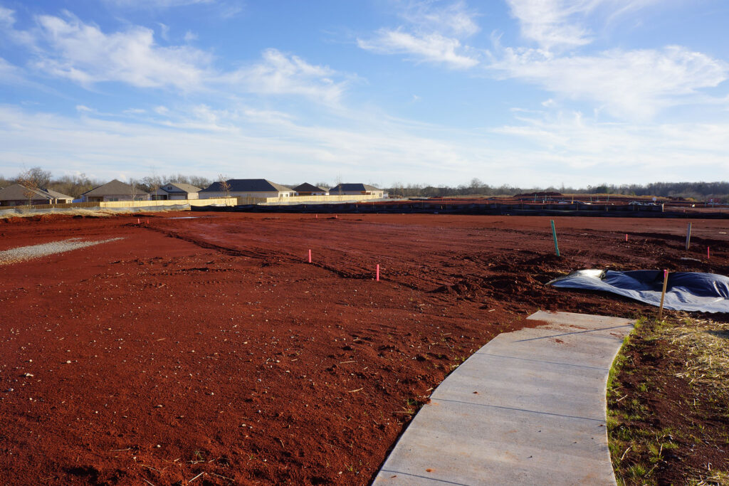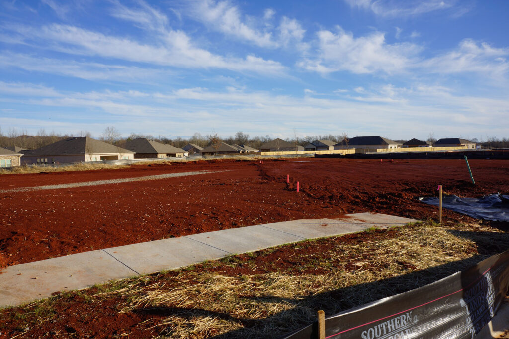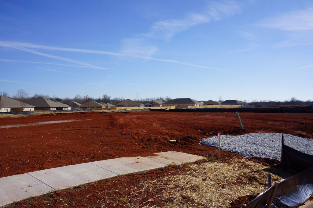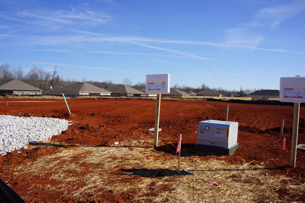 The construction workers put some gravel on the entrance to the lot and marked out where they frame the construction for the slab.